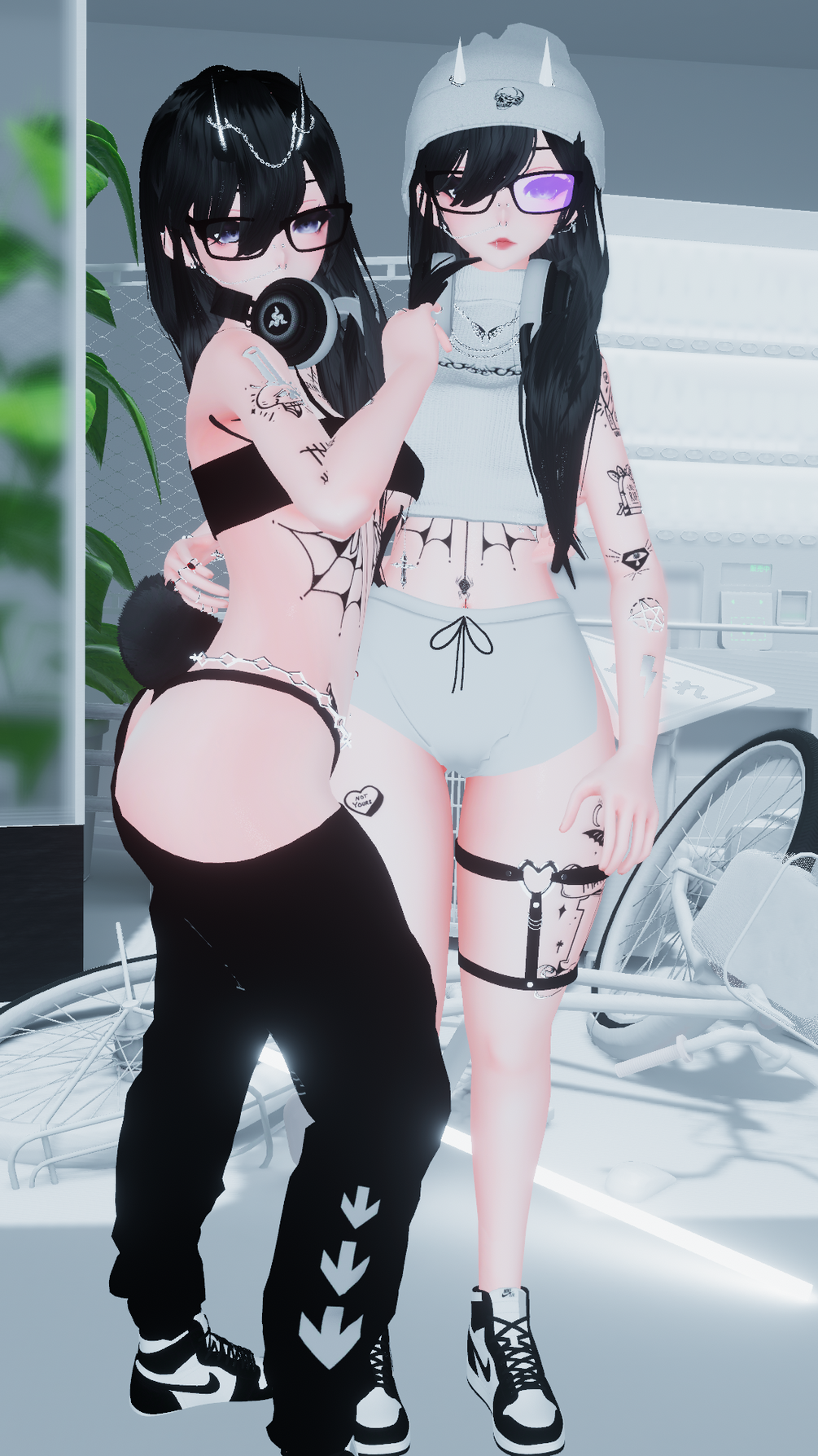 Arm spiral & Ring: Rommi#0307 & Earrings & Necklace & Double chain necklace & Headphones & Turtleneck top & Sweatpants & Garter & Hair & Horns & tail & shoes & Nipple Piercings & Septum & Tank Top & Hand Accessory & Beanie & Heart Particle & Belly piercing & short & pierning & Glasses & VRLabs Marker & Locomotion Fix by WetCat, AlcTrap, Dj Lukis.LT, INYO and Gireison